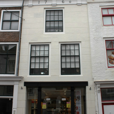 Huis met gecementeerde rechte gevel, in lijst gedateerd 1760. Winkelpui. XVIII.