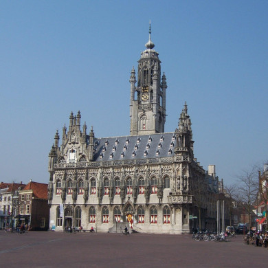 RAADHUIS, bestaande uit: een hoofdgebouw aan de Markt, met toren en traptoren 1452 en volgende jaren gebouwd en in 1512-1514 door Anthonie Keldermans voorzien van een nieuwe gevel, die werd samengevoegd met die van de gelijktijdig naast het raadhuis aan de Markt gebouwde Vleeshal. De XV toren werd in 1506-1511 voorzien van een bekroning. De natuurstenen, rijk met beeldhouwwerk versierde gevel aan de zijde van de Markt vertoont zeven traveeën van het oorspronkelijke raadhuis, met rechts op de hoek een achtkante koertoren van twee geledingen en links aangebouwd de drie met topgevel bekroonde traveeen van de Vleeshal. Er zijn twee verdiepingen, gescheiden door een waterlijst. In de penanten tussen de spitsboogvensters van de verdieping beeldnissen waarin oorspronkelijk de 25 gravenbeelden van Michiel IJwijns uit Mechelen (1512-1514), thans door replieken vervangen. De toegang, oorspronkelijk aan de zijde van de Noordstraat werd in 1613 verplaatst naar de Marktzijde. Voor de ingang een hardstenen bordes 1756. In de topgevel van de Vleeshal een in 1910 aangebracht modern beeld, voorstellende Koningin Wilhelmina met haar dochtertje. De zijgevel aan de zijde van de Noordstraat telt vijf traveeen uitgevoerd in de trant van de voorgevel, doch zonder beelden. Boven de twee linker traveeen een topgevel als bij de vleeshal. De zijgevel en achtergevel van de Vleeshal aan de Helm, eveneens van natuursteen en van spitsboogvensters voorzien, zijn uitgevoerd in eenvoudiger trant. De toren heeft vierkant benedenstuk XV, en vervolgens op een geleding met spitsboognissen een achtkant bovenstuk 1506-1511 met onderling en met de lantaren verbonden hoekpinakels. Onder het uurwerk speelwerk met ruitertjes en voetknechten (naar het oude, dat bij de brand van 1940 verloren ging, gecopieerd), en in de toren een klok uit 1527 (in 1945 uit Duitsland teruggekeerd). Inwendig: In het vernieuwde interieur is de oude indeling gehandhaafd. De gewelven over de trap, de torenkamer en de Vleeshal zijn gedeeltelijk nog oud. Nieuw tongewelf over de burgerzaal in de Vleeshal. De volgende oude elementen, van elders afkomstig, in het nieuwe interieur opgenomen: Trouwzaal: hardstenen gotische schouw, gedateerd 1549. Herkomst? Raadzaal: groot gebeeldhouwd stadswapen afkomstig uit de vroegere aanbouw 1780-'84, wellicht vervaardigd door de beeldhouwer Van Camhout. Kamer burgemeester en wethouders: Zeeuwse schouw met zandstenen pilasters en eikehouten fries. Herkomst? XVIIb. Eikehouten deur met geprofileerde panelen en ebbenhouten versiering. Herkomst? XVIIb-c. Eikehouten portaal met gesneden pilasters, vruchtguirlandes en fronton. Herkomst? XVIId. Eikehouten betimmering met dubbele deur, een kast aan weerszijden. Afkomstig uit huis te Groningen. XVIIIa.