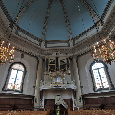 OOSTKERK. Ontworpen door B.F.Drijfhout met advies van Pieter Post. Na overlijden van Drijfhout afgebouwd door A. van 's-Gravezande, met advies van Pieter Post en C.Norwits Azn. 1647-1667. Achtzijdige centraalbouw, kolossale orde op basement, gedekt door achtzijdige koepel, waarboven een achtkante koepeltoren uitsteekt. Aangebouwde achtkante traptoren. Op de hoeken van de gevelvlakken zandstenen pilasters van de Jonische orde. Attiek voorzien van festoenen en - in het frontvlak - het wapenschild van Middelburg, opgehouden door putti. Festoenen onder de boogvensters. Op de gevelhoeken vazen. De grote koepel wordt afgesloten door een balustrade met potten op de hoeken. De lantaarnkoepel wordt door korintische kolommen gedragen en bekroond door de Middelburgse burcht en een windwijzer. Een poortomlijsting van hardsteen vertoont Jonische pilasters en een fronton waarboven door een adelaar opgehouden festoenen. Binnen het raam van de poortomlijsting een ingang met segmentvormig fronton, waarin een liggend geraamte. Aan weerskanten van de hoofdingang een hardstenen poortje met doorbroken fronton en bovenstuk met tekst in cartouche. 1656. Voor de ingangstrappen op het Kerkplein twee hardstenen obelisken. Inwendig: de koepel wordt gedragen door een zware kroonlijst op kolommen met Jonische kapitelen. Ingangspoort met Jonische pilasters en wapen in het fries. Boven de hoofdingang een door korinthische pilasters en fronton omlijst tien gebodenbord, boven de zijpoortjes cartouches met bijbelteksten. Cartouches boven de grote vensters en wapenstenen met de emblemen van regerende burgemeesters. Preekstoel op oudere voet XVIIc, preekstoel XVIII, naar wij mogen aannemen in 1783 aangebracht tegelijk met de bouw van het boven de preekstoel geplaatste orgel. Dit orgel met Hoofdwerk, Bovenwerk, Rugwerk en vrij Pedaal werd in 1781 gemaakt door de Gebr. de Rijckere uit Kortrijk. In 1782 en 1783 verbeterd en voltooid door J. Reichner en J. van Overbeek. In 1973 volledig gerestaureerd door de firma Leeflang. Fragment van een bank XVII en herenbank met hemel. Twee gebrandschilderde glazen, 1664. Klokkenstoel met gelui bestaande uit een klok van C. Noorden en J.A. de Grave, 1715, diam. 217 cm en twee moderne klokken.