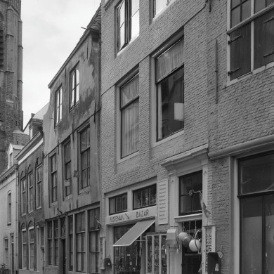 Huis met geverfde lijstgevel. Voordeuromlijsting en rozetbovenlicht. Winkelpui. XVIII-XIX.