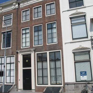 HUIS met rechte gevel op plint van hardsteen met zwarte banden. Kroonlijst met gesneden consoles en panelen. Voordeuromlijsting in Lodewijk XVI trant, vensters bovenste verdieping met originele roedenverdeling. Bovenlicht. Stoep met schuin kelderluik.