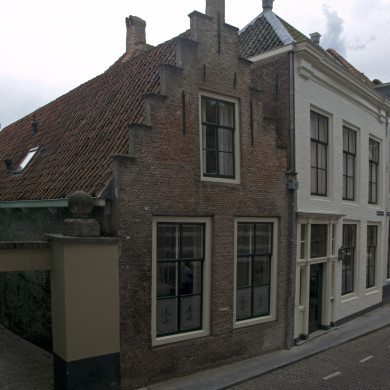 Huis met geverfde lijstgevel onder schilddak. Voordeur met rozetbovenlicht en zijlichten. Stoep. XVIII. Aansluitend geverfde trapgevel waarvan de treden met natuursteenplaten zijn gedekt. XVII.