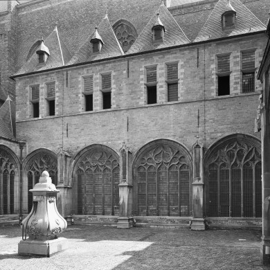 PANDHOF, eerste kwart zestiende eeuw. Door netgewelven overdekte kloostergang, de wanden rondom met natuursteen bekleed. Tussen de bogen die de hof omringen steunberen met nissen, bekroond met hogels.