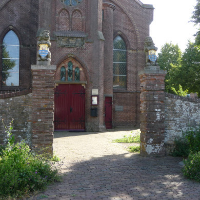 Bakstenen pijlers voorzien van schilddragende leeuwen flankeren de toegang tot het terrein van de op zichzelf niet monumentale kerk uit 1882.
