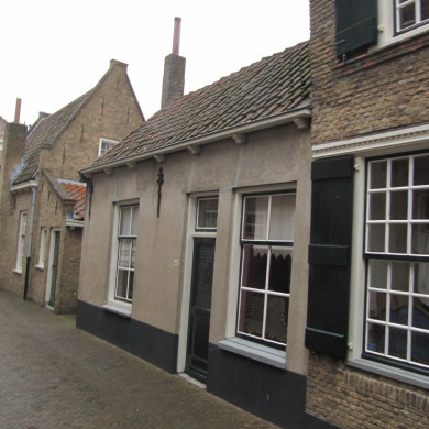 17e-Eeuws PAND MET TRAPGEVEL, welks versierd wordt door geprofileerde waterlijsten, ontlastingsbogen en een gemetselde toppilaster op console. De achtergevel wordt gevormd door de noordmuur van het overigens gesloopte koor der Hervormde Kerk.