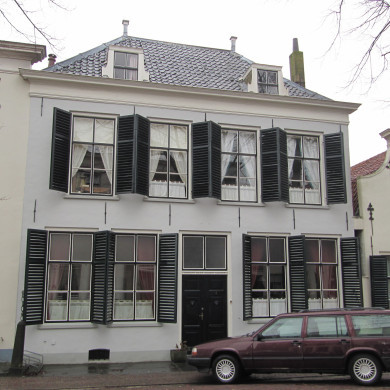 Pand uit de 17e eeuw met aan de achterzijde twee puntgevels en aan de Voorstraat een gepleisterde lijstgevel, midden 19e eeuw. IJzeren stoephekken.