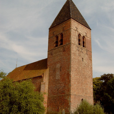Hervormde Kerk en toren op verhoogd kerkhof. Vier traveeën diep rechtgesloten kerkgebouw met forse westtoren. Twee traveeën van het schip zijn overwelfd; op een daarvan is in 1897 een muurschildering en decoratieve schilderingen aan het licht geweest en weer overgewit. In de kerk eenvoudige preekstoel met trap, achterschot en klankbord, doophek en doopbekkenstandaard. Alle banken met gestoken lijsten en telkens twee knoppen op de zijschotten. Op het koor enige zerken waaronder twee 17e eeuwse. Klokkenstoel met klok van N. Rogier en A. Obertin, 1630, diam. 123,5 cm.