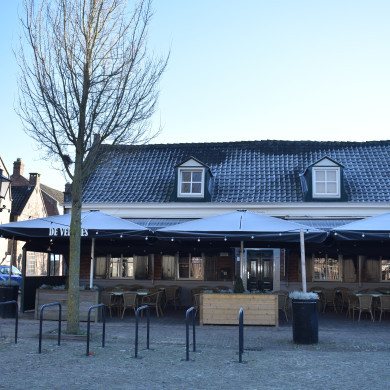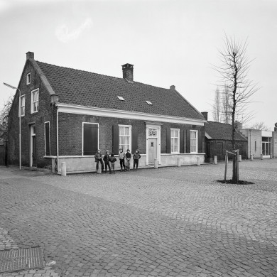 Huis met dwars zadeldak op hoge voor- en lager achtergevel tussen zijtopgevels. In de rechter zijgeveltop duivengaten en jaarankers 1665; de voorgevel gebosseerd gepleisterd; zes stoeppalen met krulhekken aan de zijkanten. Sierankers in de rechter zijgevel.