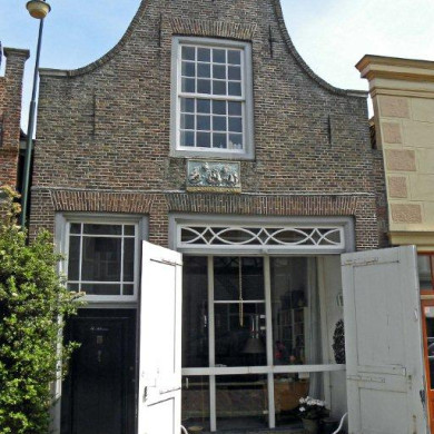 Huis met trapgevel bekroond door een gebogen fronton, XVIId. Pui XVIII. Ingang met bovenlicht in een omlijsting met verdiepte pilasters.