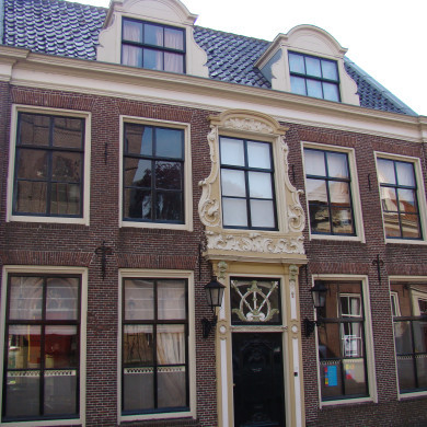 Huis met zadeldak en brede lijstgevel, voorzien van hoeklisenen en in het midden een ingangspartij met rijke deuren en vensteromlijsting, gesneden deur- en deurkalf in Lodewijk XIV- en XVI-stijl, en een lodewijk XIV-snijraam. Glooiende overgang tussen gevel en straat.