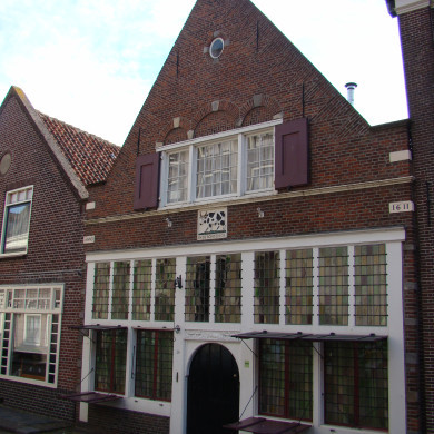 Huis met zadeldak en brede lijstgevel, voorzien van hoeklisenen en in het midden een ingangspartij met rijke deuren en vensteromlijsting, gesneden deur- en deurkalf in Lodewijk XIV- en XVI-stijl, en een lodewijk XIV-snijraam. Glooiende overgang tussen gevel en straat.