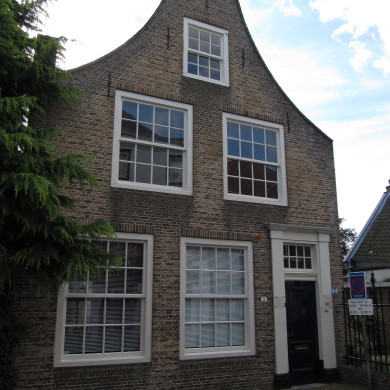 Pand met ingezwenkte gevel, 18e eeuw. Deur uit het begin der 19e eeuw binnen een omlijsting door pilasters met hoofdgestel. Vensters met twaalf- en zestienruitsschuiframen. Achterhuis met insteekverdieping, wellicht door negen- en twaalfruitsschuiframen.