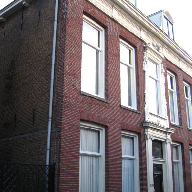 Deftig herenhuis met verdieping. Breedte: vier vensterassen. Dubbele deur met panelen, gesneden bovenlicht en omlijsting door Ionische, gecanneleerde pilasters. Hardstenen vensterdorpels. Kroonlijst met triglyphenfries. Dakkapel. Eind 18e eeuw.