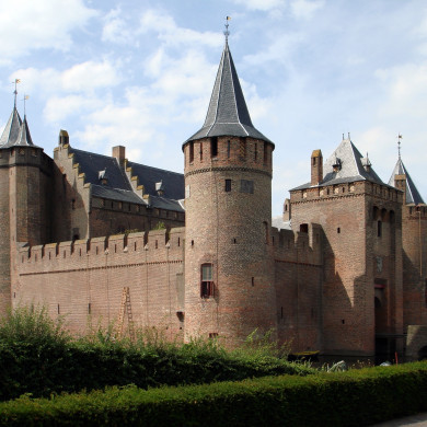 Het Muiderslot. In vestingwerken en grachten gelegen vierkant kasteel met ronde hoektoren, kort na 1280 gesticht. Gerestaureerd van 1895-1910.