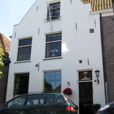 Pand met gepleisterde topgevel onder zadeldak, XVII, met ernaast gelegen depot van de Weeshuiskazerne waarvan zadeldak in topgevels eindigend.