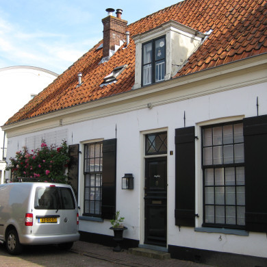 Laag gepleisterd hoekpand met rechte kroonlijst. Dakkapel.