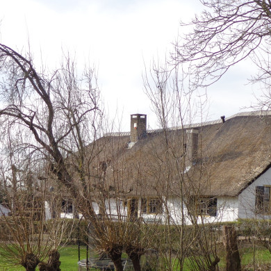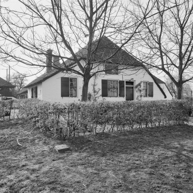 Gepleisterde boerderij, 18e eeuw, met rieten wolfdak, dat aan de achterzijde een overstek vormt. Vensters met luiken en acht- en negenruitsschuiframen. Houten schuur en roedenberg.