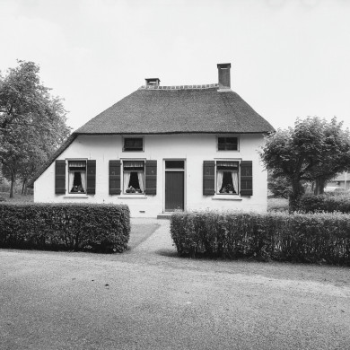Gepleisterde boerderij uit de achttiende eeuw onder rieten schilddak. Vensters met luiken.