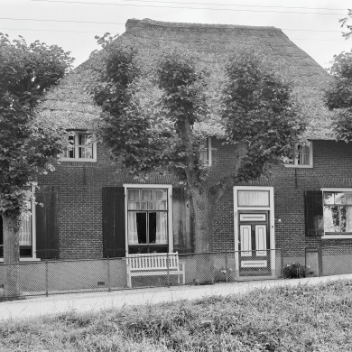 Boerderij op T-vormige plattegrond, 18e eeuw. Het woongedeelte heeft een rieten zadeldak tussen puntgevels. Links een opkamer, waarin vensters met middendorpels, onderluiken en 28-ruitsroedenverdeling. Het rechter deel heeft vensters met luiken en 20-ruitsschuiframen. Stal met overstek.