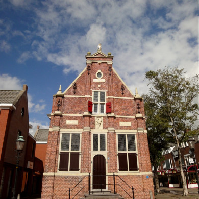 v.m. Reghthuys. Rechthoekig gebouw onder zadeldak met aan de voorzijde een rijk gedetailleerde puntgevel met pilasterstellingen, vensters met houten kruiskozijnen en luiken, topfronton met gebeeldhouwde bekronende wapenleeuw, Justitiabeeld in een nis boven de ingang en jaartal: 1628. Zes sierankers. Gerestaureerd in 1938.