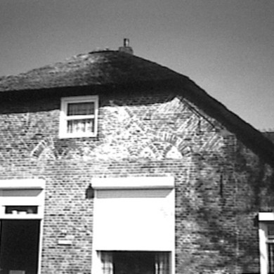 Hoge stal, deel uitmakend van een schilderachtige boerderij, waarvan het rieten zadeldak aan de voorzijde door een puntgevel wordt afgesloten.