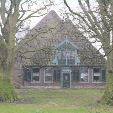 Stolphoeve met breed, uitgebouwd voorhuis en houten schuurwanden. XIX. Zeer fraaie erfbeplanting.