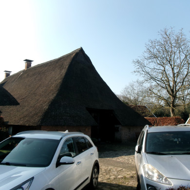 Kleine met riet gedekte boerderij; het schuurgedeelte heeft een zijbaander, het woonhuisgedeelte heeft een afgeknotte topgevel, een met pannen gedekt wolfschild en een topschoorsteen. XIX.