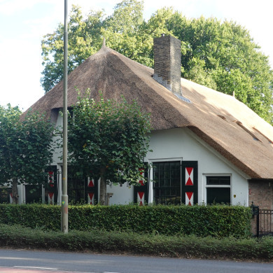 Geel gepleisterde boerderij onder rieten wolfdak. In de voorgevel ankers: 1731 en vensters met luiken en dertigruitsschuiframen.