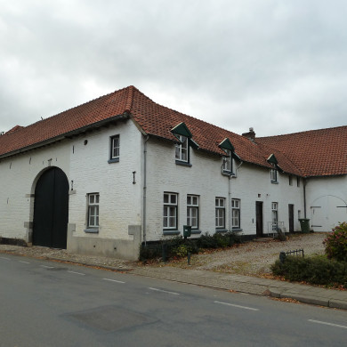 Hoeve met binnenplaats, XVIII; topgevel van vakwerk aan de straat.