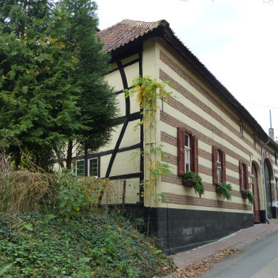 Hoeve van baksteen, gelegen aan een binnenplaats. XVIII-XIX. Een mergelstenen puntgevel aan de straatzijde witgeverfd. Gevelsteen 1714 of 1724.