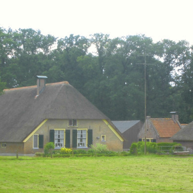 "de Ahof". Hoeve, 18e eeuw, onder rieten wolfdak met in 1852 vernieuwde deel. Vensters met kleine roedenverdeling in de ramen en luiken; opkamer en in de top een half-kruiskozijn. Bakhuis en wagenschuur. (een tweede wagenschuur en drie roedenbergen zijn gesloopt)