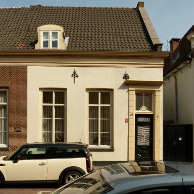 De gepleisterde lijstgevel met eenvoudige pilasteromlijsting geeft een vroeg 19e eeuws karakter, maar bezit nog een tweetal fraaie 16e eeuwse sierankers. Dakkapel met gebogen afdekking.