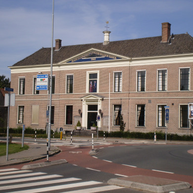 Deftig neo-klassicistisch gebouw, gadateerd 1860. Langgerekt bakstenen bouwwerk van parterre en verdieping met middenrisaliet, bekroond door fronton. Laat-empire deuromlijsting, waarboven, achter glas, een geschilderd portret van weeskinderen. Schuiframen uit de bouwtijd.