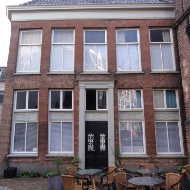 Gepleisterd huis, in oorsprong 16e eeuw, met in de zijgevel aan Achter de Hoofdwacht een tandfries en sierankers.