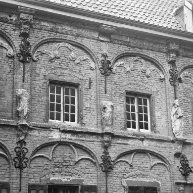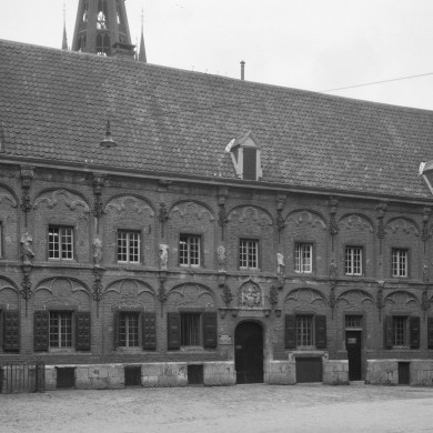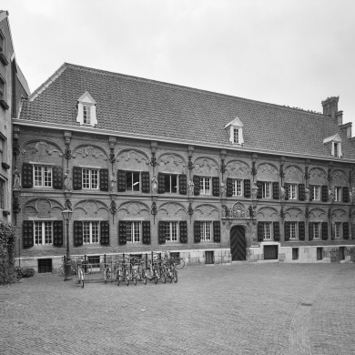 Apostolische of Latijnsche School. Langgerekt, rechthoekig gebouw met verdieping en half zadeldak, aan de westzijde afgesloten door een trapgevel, gebouwd 1544-1545 door Herman van Herengrave in vroege renaissancevormen. Gerestaureerd omstreeks 1965. Natuurstenen gotisch poortje, waarboven stadswapen in ezelsrugboog-omlijsting. Natuurstenen plint. De vensters van de benedenverdieping worden omvat door korfboognissen met driepastraceringen; hierboven een renaissancefries, onderbroken door gebeeldhouwde consoles, waarop thans vernieuwde apostelbeelden. De vensters van de verdieping worden omlijst door korfboognissen met renaissancebanderolles in de boogvelden. Kroonlijst met renaissancefries en gebeeldhouwde consoles. De zijtrapgevel bezit een rijke ornamentatie in renaissancetrant.