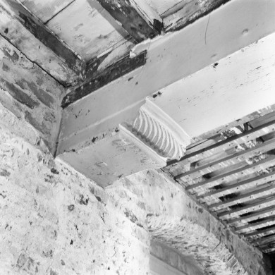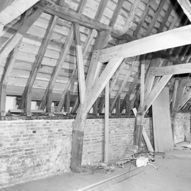Laat-middeleeuws pand met aan de voorzijde een gevel met stucversieringen, karakter derde kwart 19e eeuw en aan de achterzijde een verminkte en gepleisterde puntgevel.