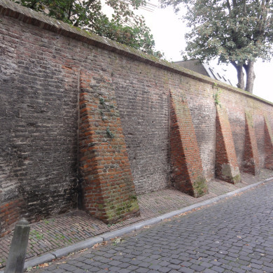 Aan de westzijde van de Ottengas een bakstenen muur met steunberen, mogelijk laat-middeleeuws.