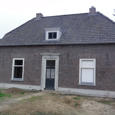 Dwarshuis onder met pannen belegd wolfdak. Omlijste midden-ingang. 19e eeuw.