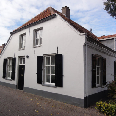Witgepleisterd dorpshuis, schuiframen, groene vensterluiken, bovenlicht met segmentvormige roeden.