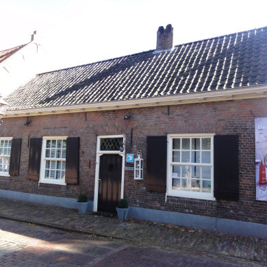 Eenvoudig gepleisterd pand onder zadeldak met zijtopgevel. 9-ruitsvensters met luiken.