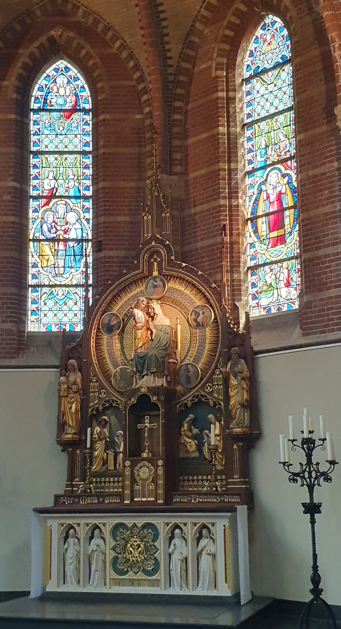 BEELDENGROEP van de H. Familie, in Neogotische stijl, geplaatst tegen de zuidzijde van de kerk, onder een eenvoudig afdak. Vermoedelijk ontwerp van het atelier Cuypers uit Roermond.