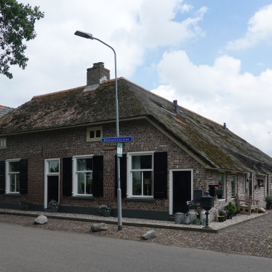 Veluwse boerderij onder rieten wolfdak, begin 19e eeuw. Vensters met zes- en negenruitsschuiframen en luiken.