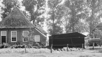 Boerderij onder afgewolfd rieten zadeldak; voorgevel met vlechtingen en schuifvensters met roedenverdeling met luiken behangen. Put met haalboom, bakhuisje met oven; links achter een L-vormig schuurtje onder rieten schilddaken, de wanden van het korte gedeelte van hout.