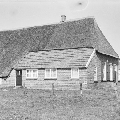 Boerderij onder afgewolfd rieten zadeldak; voorgevel met vlechtingen en schuifvensters met roedenverdeling met luiken behangen. Put met haalboom, bakhuisje met oven; links achter een L-vormig schuurtje onder rieten schilddaken, de wanden van het korte gedeelte van hout.