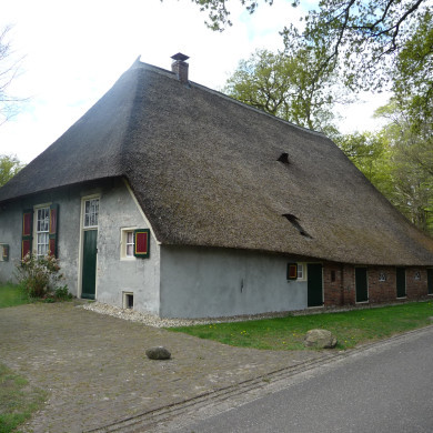 Boerderij onder fors rieten schilddak; onderschoer. De vensters van het gepleisterde woongedeelte hebben roedenverdeling en zijn met luiken behangen.