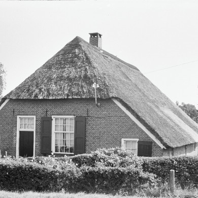 In jaarankers 1870 gedateerde BOERDERIJ onder met riet en pannen gedekt afgewolfd zadeldak; in de voorgevel schuifvensters met roedenverdeling en met luiken behangen. Schuur onder met riet en pannen gedekt schilddak.