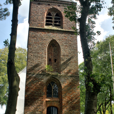 Toren van de Ned. Herv. Kerk. Vrijstaande toren uit de tweede helft van de 15e eeuw. Klokkenstoel met klok van N. Sickmans, 1626, diam. 83,4 cm.