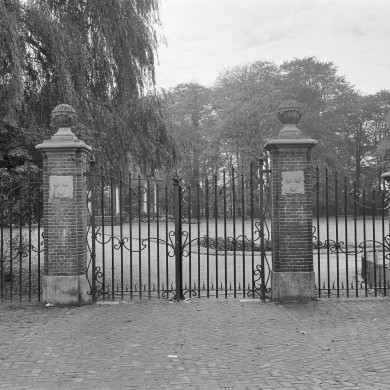 Vier gemetselde hekpalen met hardstenen ornamenten en smeedijzeren hek.