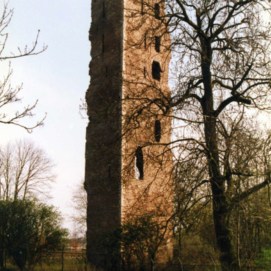 Overblijfsel van het kasteel Strijen, bestaande uit de bouwval van een hoge rechthoekige toren, ongeveer de helft der noordelijke en westelijke muren, welke ten dele door segment- en rondbogen ontlaste vensters en smalle spleten vertonen.