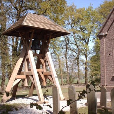 Op het kerkhof een klokkenstoel, waarin klok van J. van Bomen, 1435, diam. 88,1 cm.